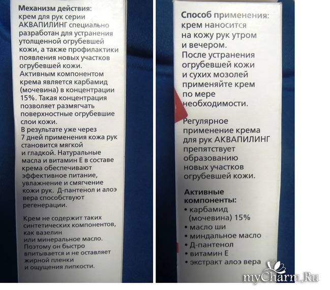 На белой коробочке присутствует изображение рук «до» и «после» использования крема. Так сказать, наглядный пример. Крем создан специально для борьбы с огрубевшими участками кожи. Описание механизма действия и активных компонентов в полной мере представлено на упаковке.