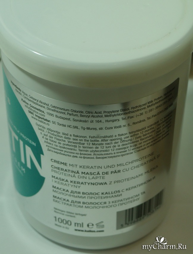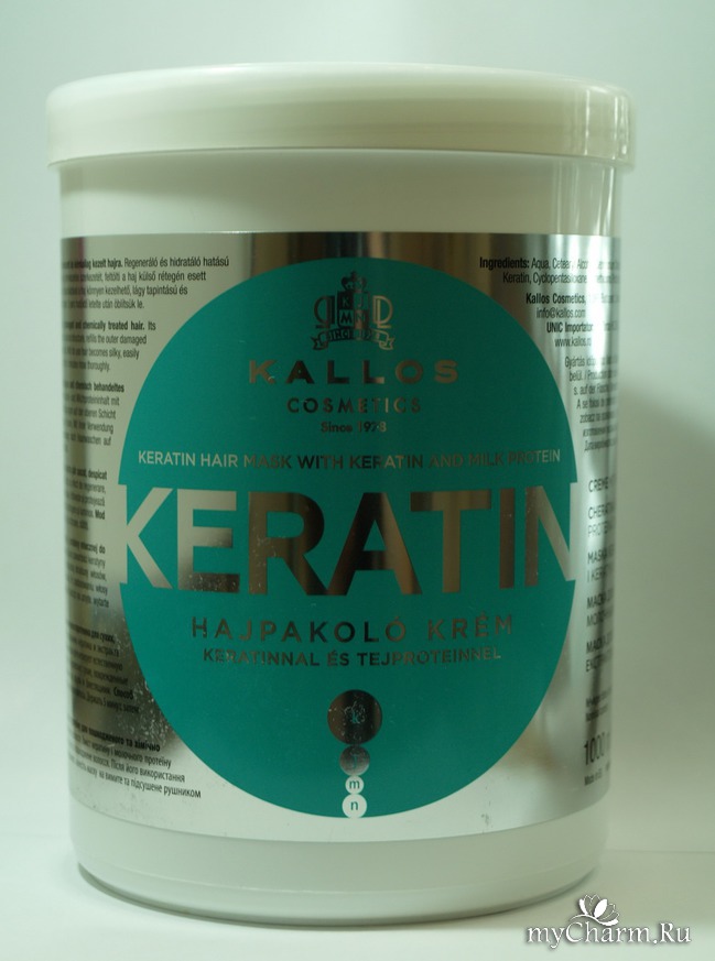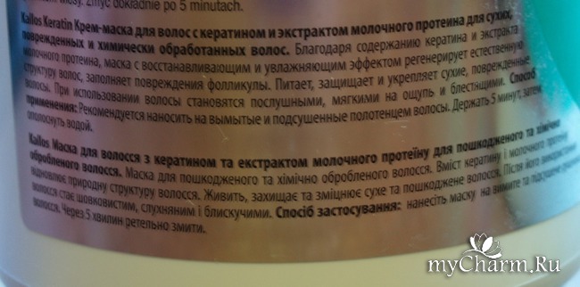 Что же обещает производитель этой маски. Маска предназначена для сухих волос, поврежденный химическим окрашиванием. Кератин, входящий в состав маски, оказывает на волосы живительное действие, восстанавливает структуру волоса, смягчает и делает их послушными. Как раз то, что я и хотела бы получить, пользуясь этой маской.