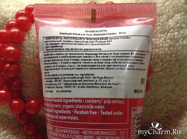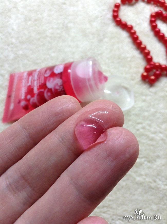 Масочка представляет собой небольшой тюбик - 50мл. Очень удобно лежит в руке и просится, чтобы его взяли с собой в дорогу, в поездки... Дизайн очень даже симпатичный - крупным планом аппетитная клюква и бросается в глаза надпись "3 минуты". Крышка открывается одним пальцем легко и непринужденно. Аромат очень яркий, запах клюквенного киселя, хочется его попробовать. Правда муж сказал, что это запах фейхоа. Так и не поняла - это была шутка или правда, он так услышал запах. При выдавливании из тюбика, маска представляет собой желеобразную консистенцию прозрачно - розового цвета. На ощупь тоже приятно.Состав.