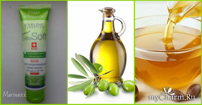 На упаковке указано, что это Восстанавливающая крем-маска для рук и ногтей 5 в 1 с оливковым маслом и маслом аргана. Ну, вы сами понимаете, что в креме за 60 р. оливковое масло может, конечно, и будет, а вот масло аргана - я сильно сомневаюсь.