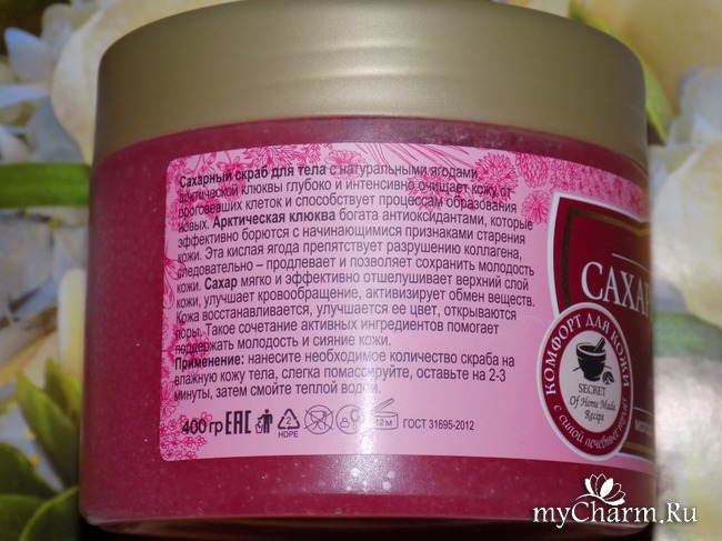 Зато содержит арктическую клюкву, богатую антиоксидантами. А они, в свою очередь, борятся со старением нашей кожи. Еще эта кисленькая ягодка препятствует разрушению коллагена, что тоже продлевает молодость кожи тела. В скрабе для отшелушивания есть сахар. Его крупицы мягко и эффективно отшелушивают верхний слой кожи, улучшают в нем кровообращение, активизируют обмен веществ.