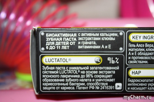 - Luctatol (запатентованная система, основой которой является экстракт лакричника японского; способствует удалению зубного налета и предупреждает его образование в течение дня, борется с патогенной кариесной средой)