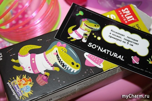 Оказывается, темноту космоса очень освежает зеленый сочный цвет. Это еще раз доказала крокодилица-космонавт, украшающая витринную сторону коробки. Она очаровательна с розовыми аксессуарами в виде банта и пояса. Деткам придется по вкусу. А еще им понравятся веселые вложения- наклейки с изображением героем Splat или Фиксиками, которые делятся научной информацией.