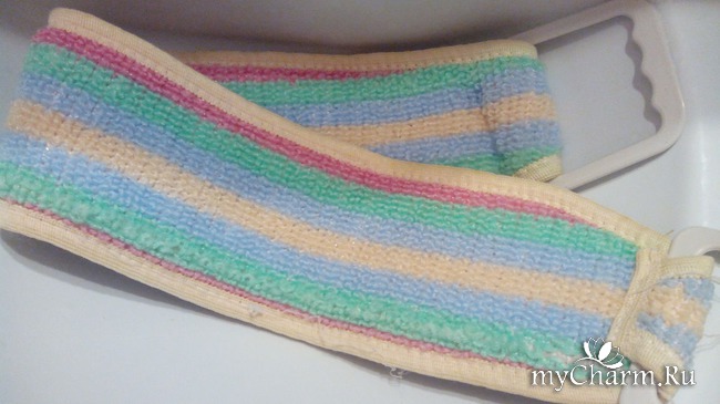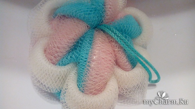 Первый раз я нанесла его на синтетическую, достаточно плотную мочалку.