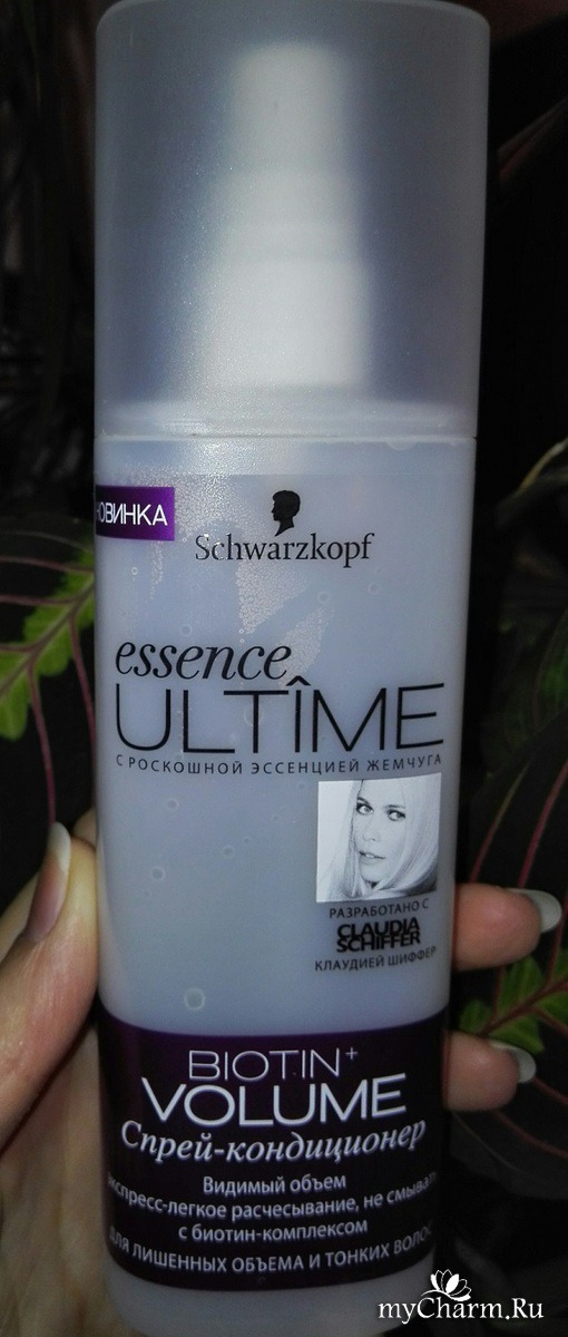 Для легкого расчесывания моих волос я использую Спрей-кондиционер Essence Ultime "Biotin+ Volume" Schwarzkopf. Вообще, спрей предназначен для волос, которым требуется объем. У меня пышная шевелюра, объем есть. Но волосы постоянно пушатся и запутываются, так как тонкие. Поэтому для моего типа волос требуется использовать «несмывашки», помогающие их безболезненно причесывать.