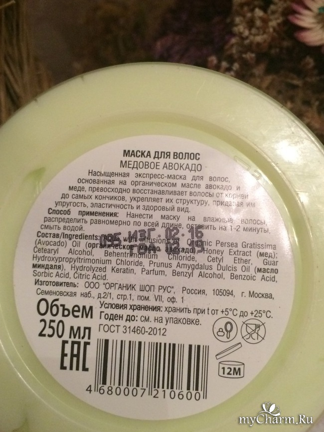 Это пластиковая баночка, объемом в 250 мл. В принципе, удобная, интересный дизайн, как и большая часть их продукции, в одинаковом инвентаре. О некоторых продуктах данной марки я уже писала здесь: https://www.mycharm.ru/kosmetika/obzory/shokoladnye-fantazii-so-skrabom-belgijskij-shokolad-ot-organic-shop/; https://www.mycharm.ru/kosmetika/obzory/marokkanskaya-krasota-vashih-volos-s-planeta-organica/.