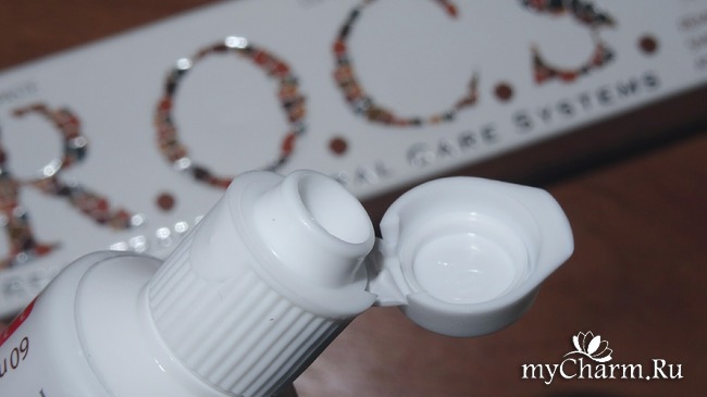 Сама паста имеет очень удобную крышку клик, потому что лично я, откручивая крышку пасты, постоянно ее роняю. Здесь же такой проблемы можно легко избежать.
