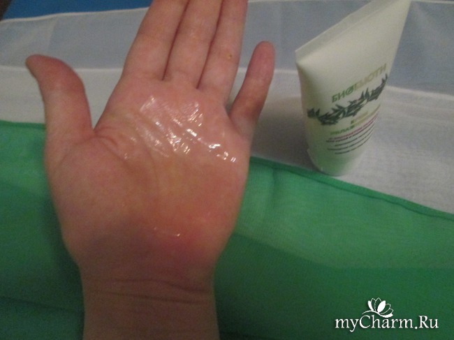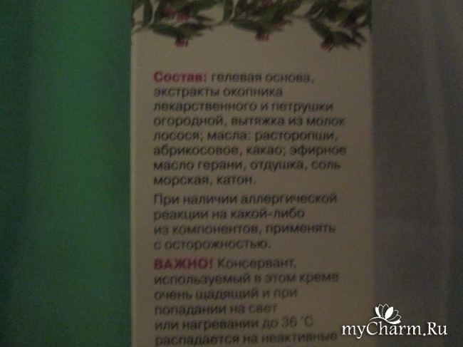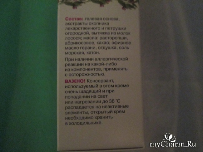 Состав, как и у всех косметических средств этого бренда, очень богат. В нем кроме гелевой основы содержатся экстракты окопника лекарственного, петрушки огородной, вытяжка из молок лосося (вот это меня даже немножко позабавило, заодно порадовало, зная, что они содержат антиоксиданты); масла: абрикосовое, расторопши, какао, эфирное масло герани; соль морская, отдушка, катон.