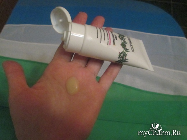 Крем чуть желтоватый, гелевая основа. Аромат крема травяной. Немного на любителя, специфический, чуть сладковатый. У меня, во всяком случае, отторжения не вызывал. Запах после нанесения крема быстро выветривался с поверхности кожи.