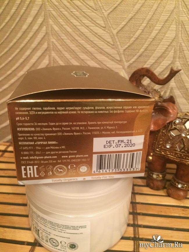Оформление упаковки просто невероятно привлекательное. Вся коробочка с маской переливается и имеет красивые картинки, надписи. Даже не вскрывая упаковку, я уже чувствую сладкий аромат средства для волос. Внутри находится белая баночка из пластика с винтовой крышкой. Объем маски для волос составляет 250 мл. Для моих коротких волос ее хватит надолго. Несмотря на состав, в котором преобладают экстракты и другие органические ингредиенты, срок годности составляет тридцать шесть месяцев.