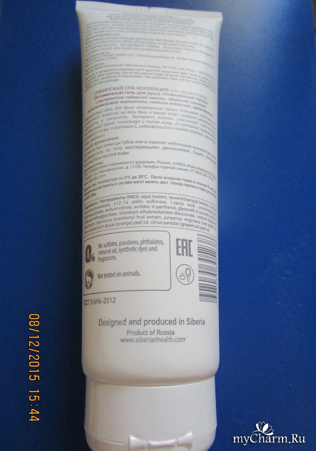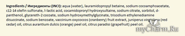 Средство находится в таком вот длинном тюбике, напоминающим тюбик из-под крема. Оформление очень простое и скромное: на лицевой стороне изображен кустик клюквы интересного, бросающегося в глаза оттенка (кстати, кто знает, какой это цвет?), написаны названия коллекции, самого геля и объем.