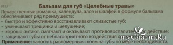 Тюбик с бальзамом упакован в картонную коробочку, на которой есть вся необходимая информация о данном косметическом средстве. Сбоку можно увидеть те самые целебные травы, которые входят в состав бальзама как активные компоненты.