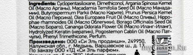 Итак, состав. Во-первых, в данном средстве действительно содержится кератин. А во-вторых, на упаковке Сиэль гордо пишет про наличие девяти масел в составе. Так что мы видим, что большую часть этого списка как раз и занимают эти ценные ингредиенты. Помимо кератина и масел в составе мы видим три длинных компонента, которые являются силиконами, и лишь в самом конце списка стоит ароматизатор.