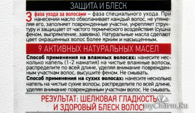 Ну а какой результат дает мне это масло, помимо защиты от фена и сечения? А для этого я предлагаю вспомнить, что нам было обещано на самом флаконе...
