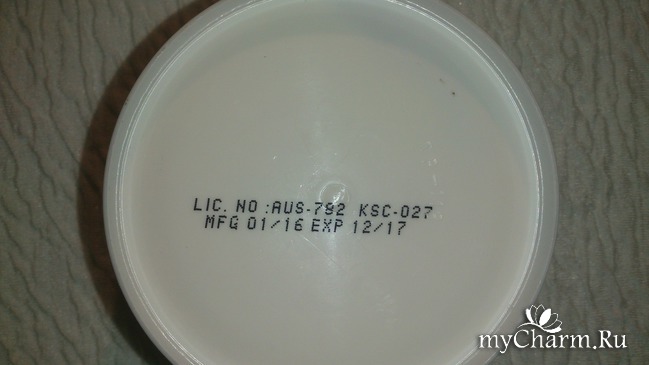 Внутри упаковки круглая баночка из твердого пластика с закручивающейся крышечкой. На верхней поверхности наклейка с названием. На нижней поверхности указана серия, дата изготовления и дата окончания срока годности.