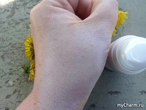 По коже он распределяется легко, в процессе обволакивая её тончайшим мерцающим слоем. Тут главное – не переборщить со средством. В первый раз я взяла, как позже оказалось, слишком большую порцию, в результате чего было ощущение, что кожу покрыло беловатое напыление с едва заметным свечением. Пришлось смывать крем с кожи и повторять нанесение, не допуская излишка средства на коже. Кстати, он отлично смывается с помощью пенки для умывания - никакого следа не остаётся.