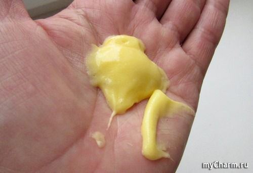 Собственно продукт желтого цвета, с приятным ароматом, который остается на волосах, но недолго.