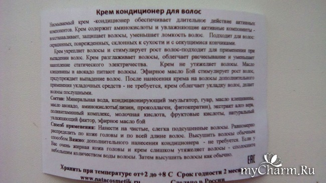 Крем-кондиционер представлен в пластиковом флаконе зеленой окраски, оснащенном удобным дозатором, позволяющим получить порцию средства, которой хватает на одну процедуру. К флакону приложен бумажный вкладыш, повествующий об особенностях средства, его преимуществах, составе, способе применения и важных нюансах. Объем составляет 250 мл. Срок годности всего два месяца, что в принципе ничуть не удивительно, ведь в составе значатся только натуральные компоненты.Консистенция крема-кондиционера довольно густая, белая. Аромат еле слышный, приятный. Средство легко распределяется по волосам, не оставляя на руках, да и шевелюре, липкости, жирности и прочих неприятных явлений. Волосы сей продукт не утяжеляет, даже если его не смыть, главное подобрать оптимальную дозу. Если чуть переборщить с кремом-кондиционером, будет сопровождать чувство немытых волос, хотя внешне это никак не проявляется.