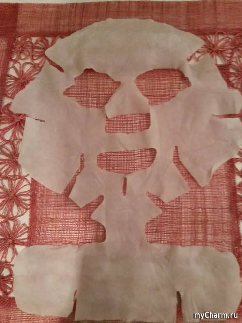 Прорези для глаз, носа с небольшими кармашками. Фактура у маски плотная, благодаря обильной пропитке маска все 15-20 минут процедуры остается влажной.