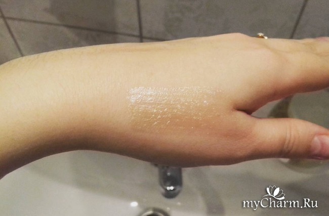 Что касается содержимого: вязкая текстура персикового цвета, микро гранулы, которые в нем содержаться придают ему глянцевый вид. Аромат не резкий – он приятный, цветочный и успокаивающий.