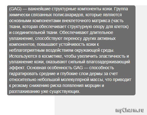 Гликозаминогликаны. В биохимии я не сильна, поэтому описать этот компонент для меня сложно. Что говорит о нем производитель: