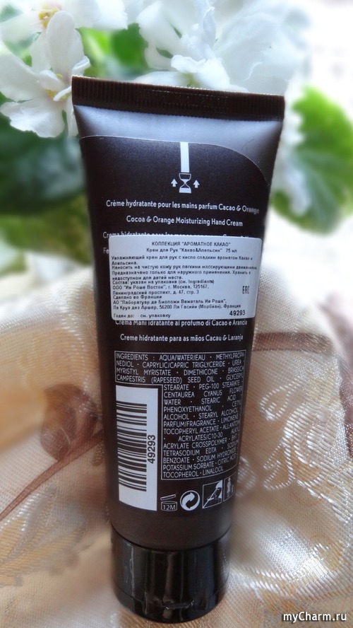 Вообще марка Yves Rocher всегда славилась своими натуральными компонентами и высокими стандартами качества растительного сырья. Часть растений для своих косметических средств они выращивают сами на территории Франции на собственных полях. Растения, которые не растут во Франции, они находят у локальных поставщиков, деятельность которых отвечает принципам бережного отношения человека к природе. Поэтому и крем для рук "Какао и апельсин" тоже имеет в своем составе ряд ингредиентов, имеющих растительное происхождение, в том числе экстракт цветов василька, который отлично успокаивает и увлажняет кожу и рапсовое масло. Экстракт какао и эфирное апельсиновое масло содержатся в парфюмерной композиции. В креме нет парабенов.