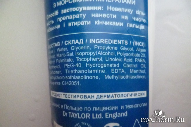 Обращаясь к составу бальзама-геля, становится ясно, что его лишь с трудом можно отнести к натуральному средству. Но производитель ведь и не позиционирует продукт в качестве натурального. Отрадно то, что в нем заявленный экстракт морских минералов находится на начальных позициях состава.