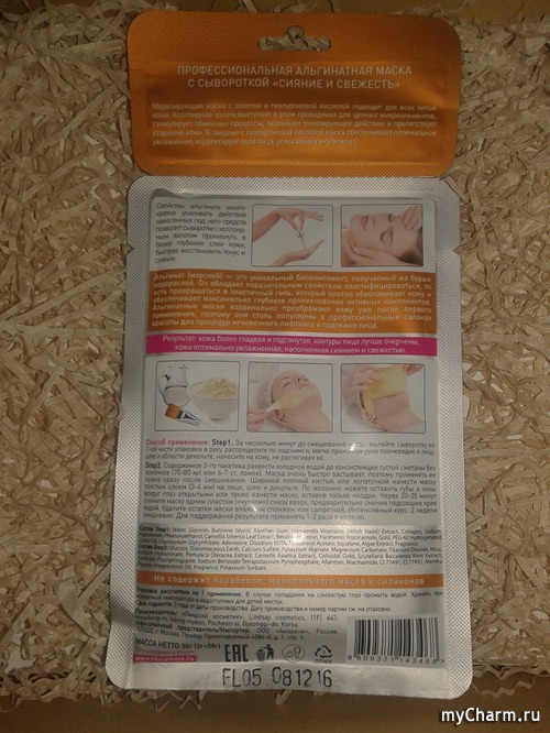 Альгинатная маска "Сияние и Свежесть" находится в небольшой и очень красивой мягкой упаковке, поделенной на 2 части. Первая часть - это маленький оранжевый пакетик, содержит ухаживающую сыворотку, а второй уже побольше - в нем находится сама маска.
