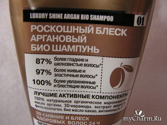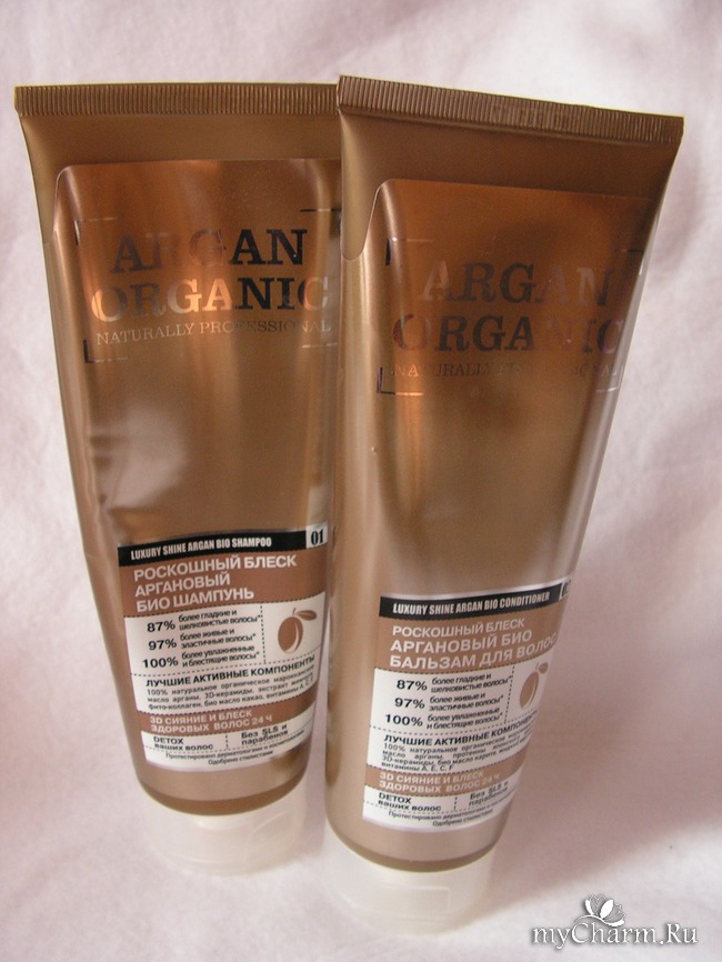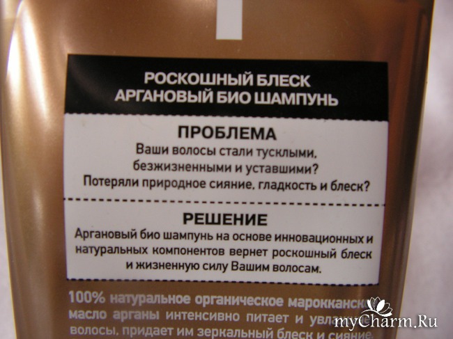 Итак, приобрела сразу два средства "Роскошный блеск" (комплектом): Аргановый био шампунь и Аргановый био бальзам для волос. Про бальзам расскажу чуть позже, а сейчас подробнее про шампунь.