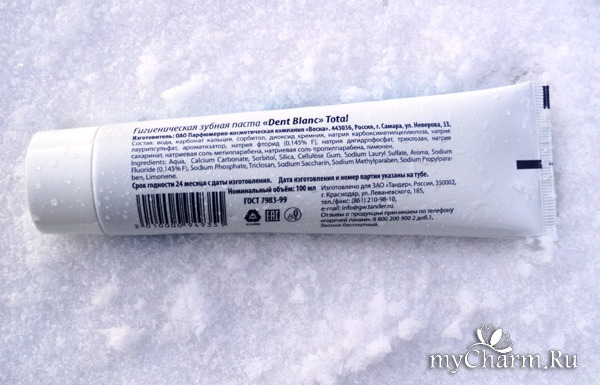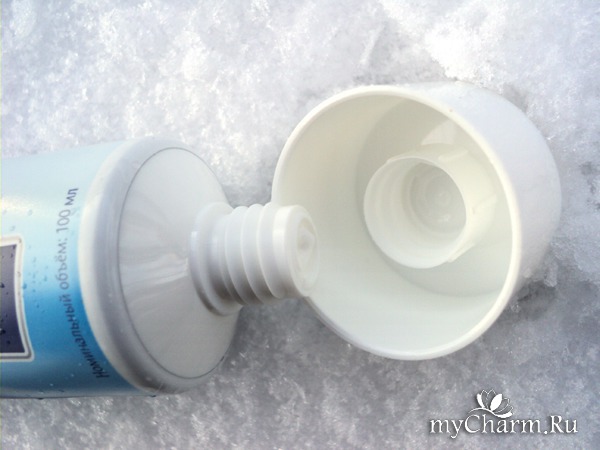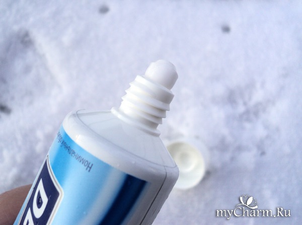 Этот тюбик создан из матового пластика. Белоснежный и качественный. От него так и веет свежестью. Наверное, поэтому мне захотелось его сфотографировать на фоне только что выпавшего снега.