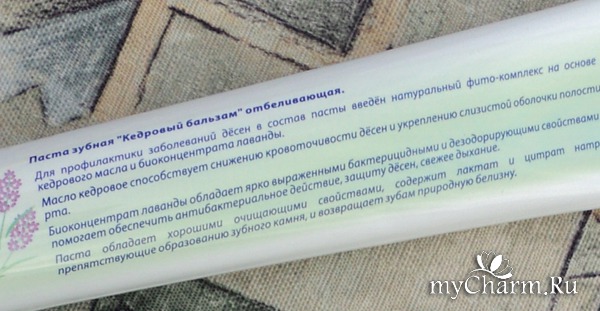 На упаковке сказано о фито-комплексе, который входит в состав пасты и призван стать профилактикой заболеваний десен. Этот фито-комплекс должен состоять из кедрового масла и биоконцентрата лаванды.Смотрим состав.