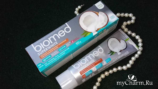 Зубная паста Super White от Biomed как раз и отличается натуральным составом и приятной ценой. Продукт позиционируется, как средство отбеливающее и укрепляющее чувствительную эмаль зубов.