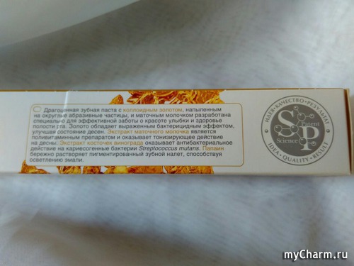 С боковых сторон находим более подробное описание всех активных компонентов пасты – маточного молочка, коллоидного золота, алмазного экстракта, природного Кальциса, экстракта косточек винограда и папаина. Особо подчеркивается, что продукт не содержит фтор.