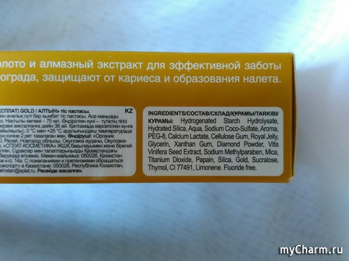 Если вы обратите внимание на состав, обнаружите, что в нем нет SLS и SLES, так любимые многими другими производителями. В качестве пенообразующего и очищающего компонента здесь используется Sodium Coco-Sulfate, намного щадящий по своим качествам, чем SLS и SLES. Обещанное коллоидное золото, алмазная пыльца и все другое в пасте точно имеются.
