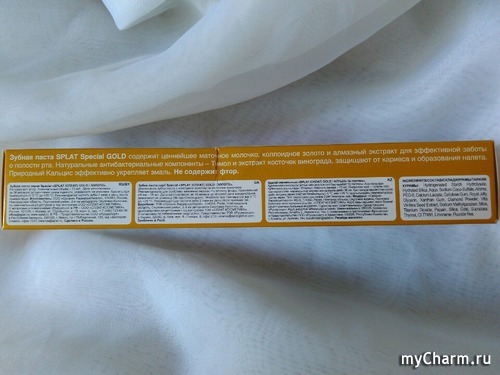 Надеюсь, я не слишком вас утомила своими рассказами. Перейдем непосредственно к самой зубной пасте Splat Gold. Тюбик у средства тоже такого же оформления, как и коробочка, поэтому вдаваться в подробности не стану.Срок хранения зубной пасты составляет 3 года с момента изготовления, и год с момента вскрытия тюбика.