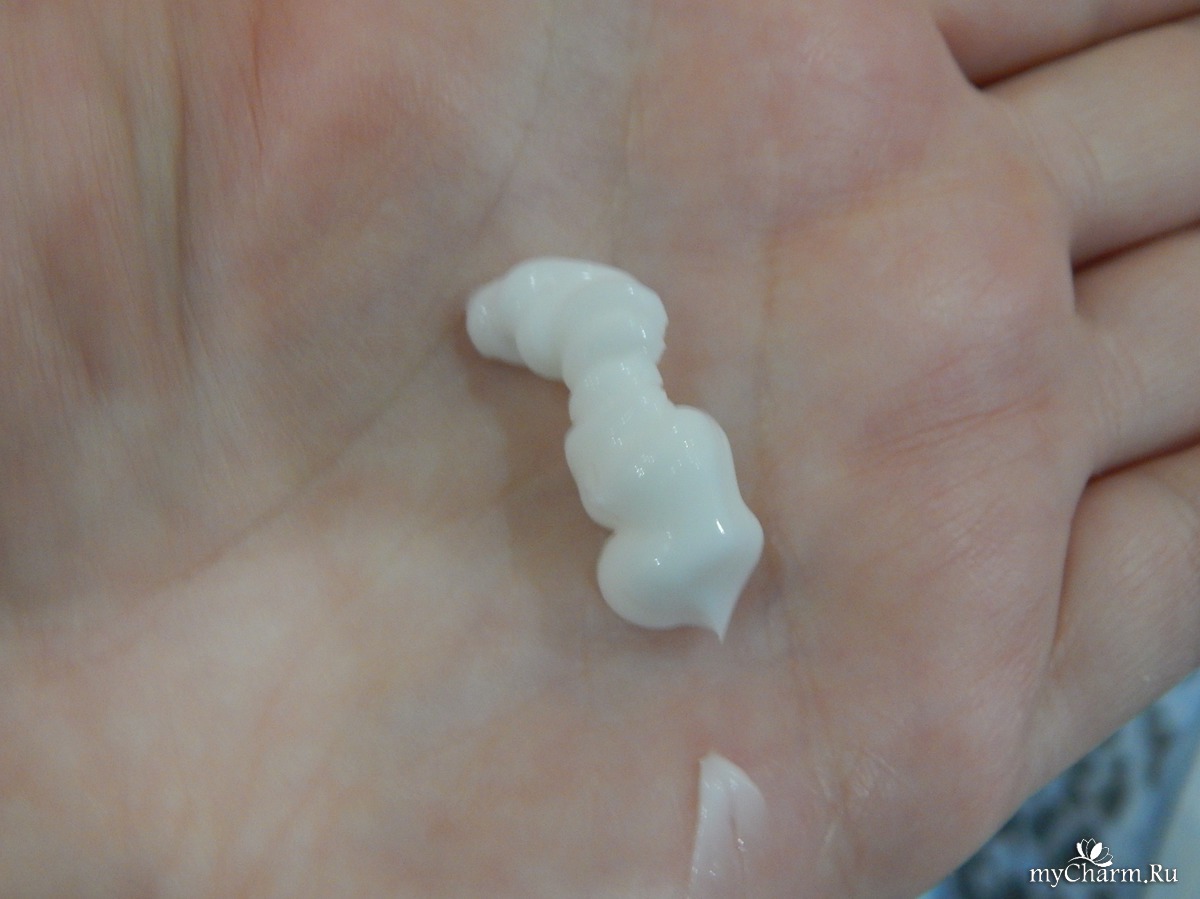 Нежная текстура крема средней жидкости хорошо впитывается в кожу, не оставляя следов жирности.