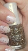 Очень дешёвый лак российского производства с золотистыми металлизированными блёстками формы маленького шестиугольника, лак густой, при нанесении за один раз на ноготь ложится довольно много блёсток. Можно класть вторым слоем поверх какого-то яркого однотонного лака, получается очень эффектно. Единственная трудность - смыть лак, когда он надоест. Блёстки "намертво" держатся, надо прикладывать и жидкость для снятия лака и механическое усилие, чтобы их убрать с ногтей.