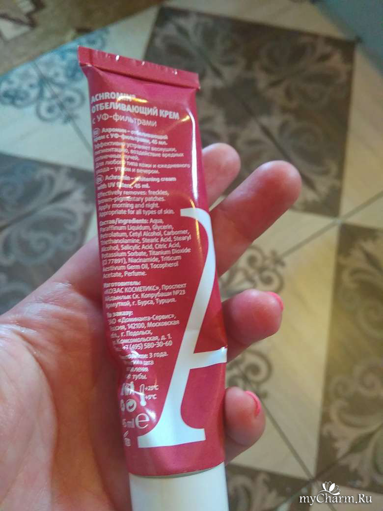 Всем доброго времени суток! Делюсь скорей своими достижениями на поприще борьбы с послеродовой пигментацией. Да-да, обычно у всех пигментные пятна проявляются еще во время беременности, а у меня после родов пошел гормональный сбой и я начала страдать от жутких пятен на лице, шее и плечах. Ничего не помогало от них избавиться. Под ничего подразумеваю народные способы и бабушкины советы. Решила перейти к более современным средствам, а именно к кремам. Ахромин каким-то чудесным образом получился в списке первым. Выбирала по отзывам и обзорам. Крем в небольшой тубе, объемом 45 мл. Крем достаточно плотной консистенции, наносится легко, кожу не стягивает. Даже наоборот, придает ей какую-то бархатистость. Словом, как ведет себя на коже, мне понравилось. По ощущениям еще и увлажняет. Применяла его два раза в день – один раз с утра, второй раз перед сном. Естественно после полного очищения и тонизирования. Теперь про эффект. Крем прекрасно избавил меня от пигментации. Мне даже и во сне не снилось, что настолько качественно он сработает. Кожа стала более светлой, сияющей, здоровой на вид. Никаких точечек и пятнышек. Полное впечатление, что я замазалась тональным кремом, только этого крема тоже не видно. Ровный, красивый, отличный тон! Ахромину твердая пятерка! Рекомендую!