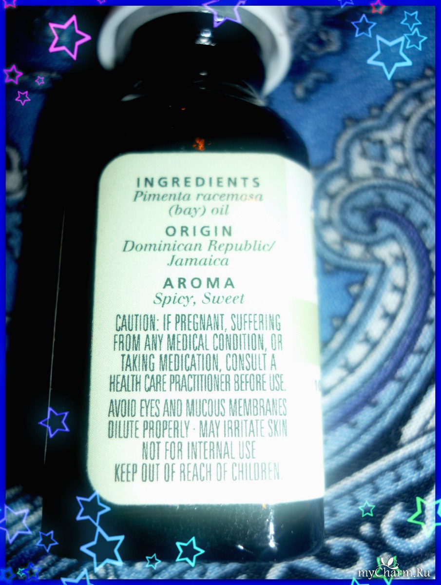 100% эфирное масло бей. Объем пузырька 15 мл., цена около 500 рублей. Масло очень многофункционально, конечно же главный способ использования в масках для волос. ЭМ бей хорошо укрепляет корни волос, препятствует выпадению, усиливает скорость роста волос за счет согревающего эффекта. Имеет специфический запах который многим не приятен, но лично я к нему отношусь весьма спокойно. Из недостатков: заказать можно только в американских интернет-магазинах.