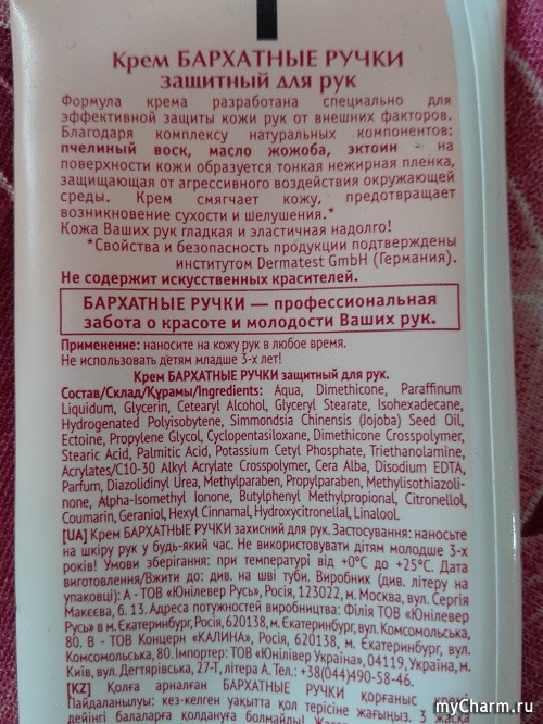 Сколько покупаю разных видов крема для рук, но Бархатные ручки время от времени все равно беру. Потому что крем действительно хороший. Пчелиный воск хорошо защищает кожу рук от пересыхания и агрессивного воздействия окружающей среды. Крем придает коже рук мягкость и шелковистость.