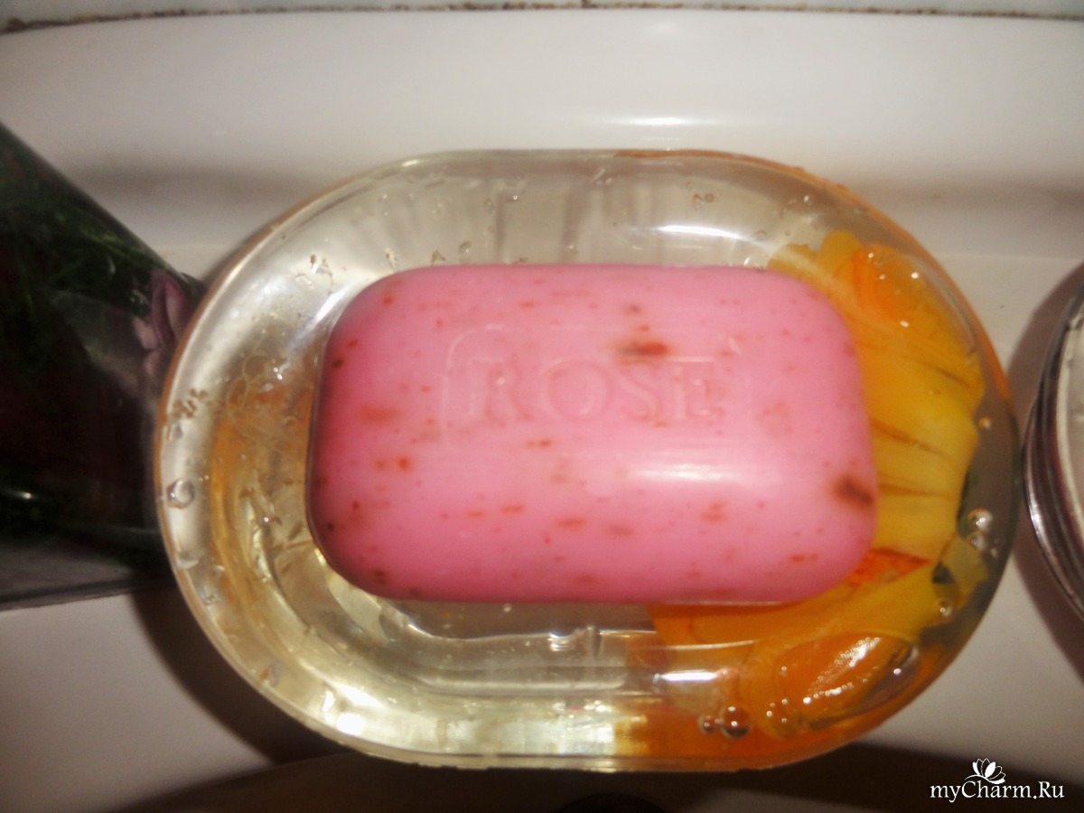 Мыло нежно очищает кожу, не сушит ее при этом. В составе есть частички лепестков роз, которые нежно скрабируют кожу. Заявлено, что мыло натуральное, но на самом деле состав не идеален. Подходит для мытья рук и тела, но не для очищения лица. Аромат роз в мыле чудесен!