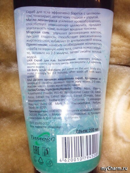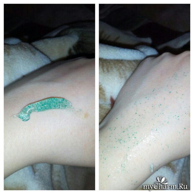 Упаковка - туба из мягкого пластика. Виден расход средства. Легко получить скраб, нажав на тубу. Гелеобразная консистенция с большим количеством скрабирующих частичек - зеленые и белые частички (последние - это морская соль). В составе много полезных компонентов. Запах просто сногсшибательный - аромат лимонной конфетки. Эффективно отшелушивает и очищает кожу, придает ей гладкость и мягкость. Не вызывает аллергии. Стоимость менее 100 рублей.
