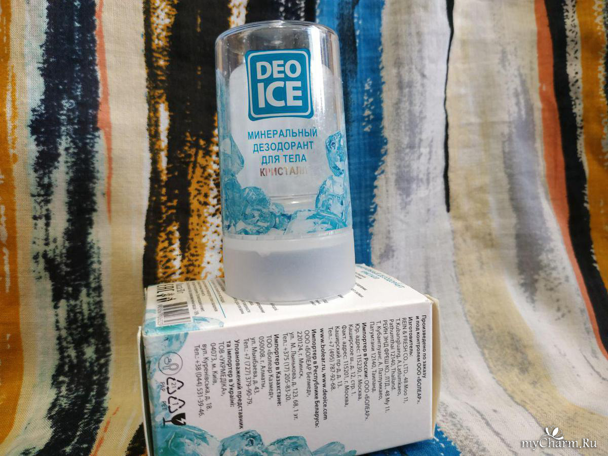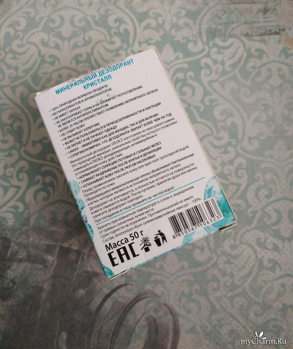 Подруга рассказала мне о DEOICE. Стоит он около 300-350 рублей за 50 г. Пусть такой маленький объем вас не удивляет, хватает его при этом на год так точно, это при ежедневном его использовании. Теперь пару слов о его применении. Его нужно намочить под струей воды и интенсивно нанести на чистую кожу в подмышечной зоне. Обычно, что при использовании обычных дезодорантов они сразу ощущаются на коже после нанесения, после него же никаких ощущений нет, впитывается он быстро и не оставляет следы на одежде. Казалось бы, какой может быть эффект от кучки кристалла, а нет он отлично уничтожает запах пота. А учитывая то, что он имеет еще и дезинфицирующие свойства, плюс натуральный состав делают его просто незаменимым средством. Он существенно отличается по безопасности от обычных шарико-роликовых дезодорантов, которые представлены в широком ассортименте в магазинах, для меня он просто идеален.