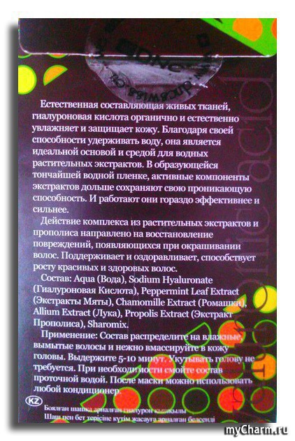 В коробочке три пакетика со средством. Цвет янтарный, консистенция чуть гелеобразная, но жидкая. Наносила на влажные чистые волосы (пакетика хватает на несколько раз), втирала в корни и распределяла по длине. После высыхания волосы разглаживаются, становятся эластичней. Думаю, кислота влияет на структуру волос. Средство отличное!