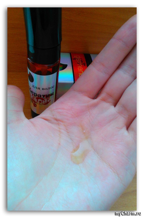 Кератин с легким чуть сладковатым травяным запахом (вероятно, это запах экстрактов трав, которые находятся в составе, сложно уловить, какой именно), не густой и в меру жидкий. Не имеет ярко выраженного цвета. Как мутноватая капля воды.