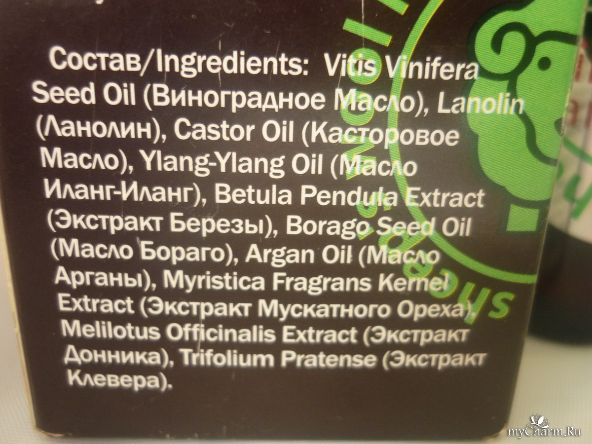 Состав: Виноградное Масло, Ланолин, Касторовое Масло, Масло Иланг-Иланг, Экстракт Березы, Масло Бораго, Масло Арганы, Масло Мускатного Ореха, Экстракт Донника, Экстракт Клевера