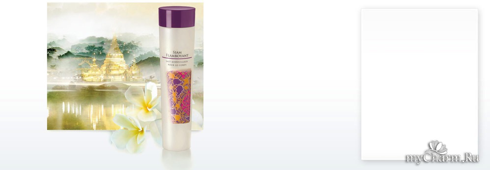 Бархатное упоительное увлажнение Великолепное молочко для тела Siam Flamboyant* питает Вашу кожу, делая ее изумительно бархатистой. Увлажненная и ухоженная, Ваша кожа приобретает сияющий вид и источает нежнейший аромат. Восточный аромат, рождающий мысли о теплом климате и сладости жизни в Королевстве Сиам. Верхние ноты мандарина и белого перца погружают в яркий мир цитрусовой свежести...