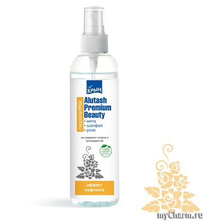 Состав: гидролат мяты, гидролат шалфея лекарственного, гидролат розы. Не содержит спирта и консервантов. Гидролаты Алуштинского эфиромасличного совхоз-завода производятся с использованием воды Чатыр-Дагской с источника Хачи-I вулканического масива Чатыр-Даг.