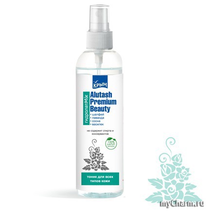Состав: гидролат шалфея лекарственный, гидролат лаванды, гидролат сосны, гидролат василька. Не содержит спирта и консервантов. Гидролаты Алуштинского эфиромасличного совхоз-завода производятся с использованием воды Чатыр-Дагской с источника Хачи-I вулканического масива Чатыр-Даг.