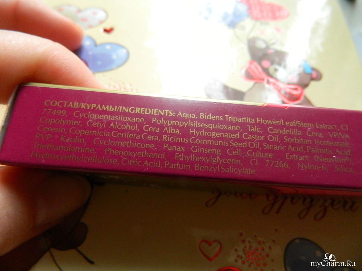 Состав: вода очищенная, экстракт череды, CI 77499, гидрогенизированный полиизобутен, тальк, канделильский воск, сополимер ПВП и винилацетата, цетиловый спирт, касторовое масло, пчелиный воск, сорбитанизостеарат, церезин, карнаубский воск, полидон, каолин, стеарин, циклометикон, биоантиоксидантный комплекс Неовитин, триэтаноламин